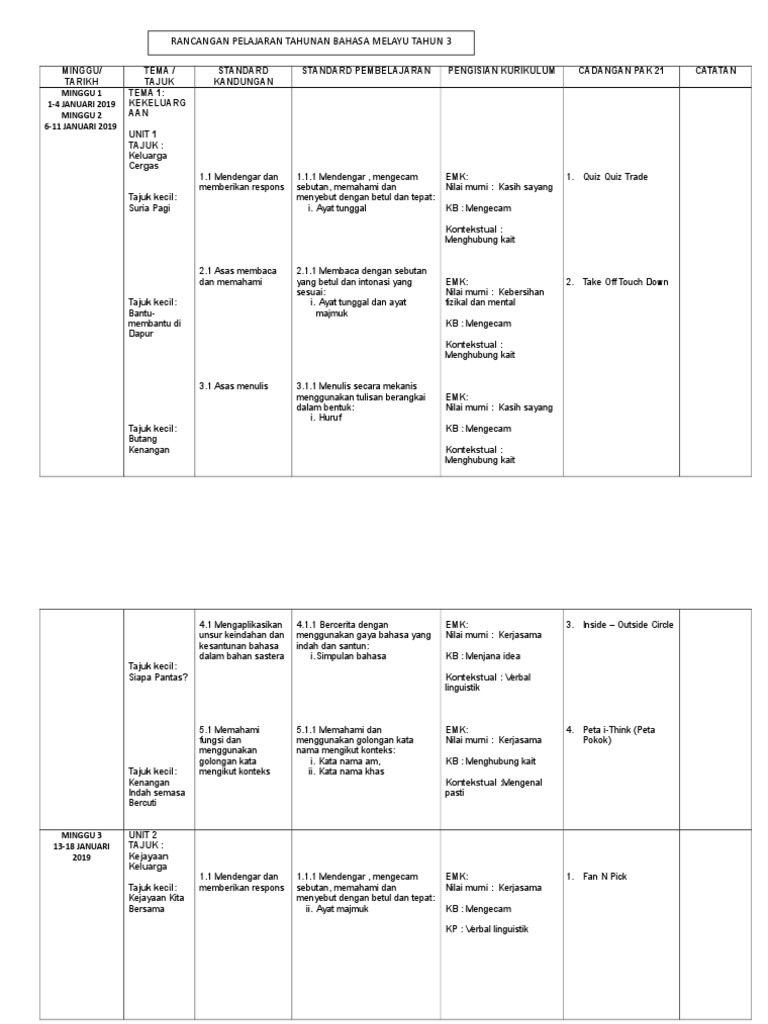 Rancangan Pengajaran Tahunan Bahasa Melayu Tahun Bahasa Melayu Tahun 3 2019 Minggu Tarikh 1 1 1 1 from demo.dokumen.tips Rancangan pengajaran harian bahasa melayu tahun 3 minggu rpt bahasa melayu tahun 3 2021 : Savesave rpt bm thn 3_ 2019 edit for later. 30 orang umur murid : Kssr semakan ini adalah perkongsian oleh rozayus academy yang membantu guru guru membuat perancangan. Rph bm tahun 3 2019. Rpt bahasa arab & pendidikan islam kegunaan tahun 2020. Text of rph bm tahun 3 kssr. Rpt pendidikan muzik tahun 3.